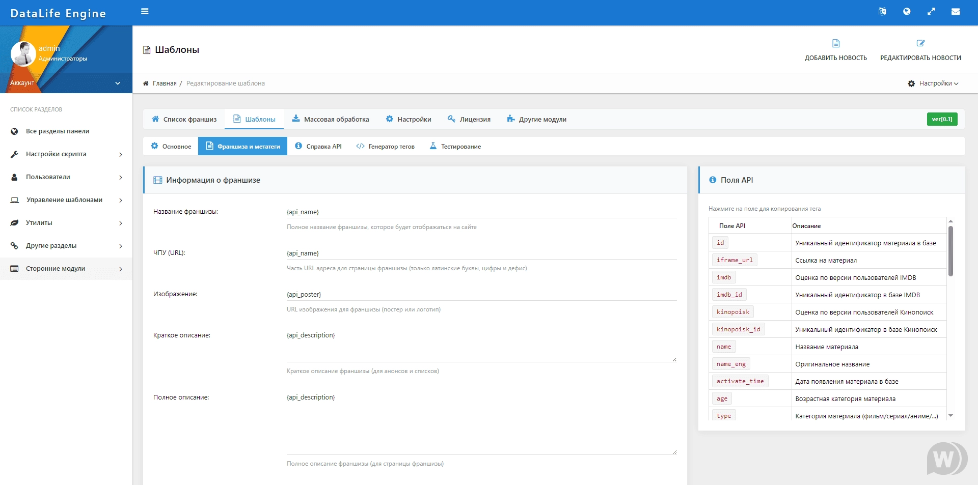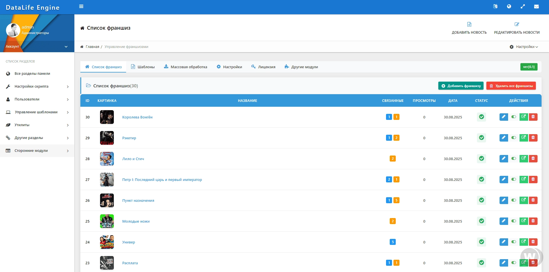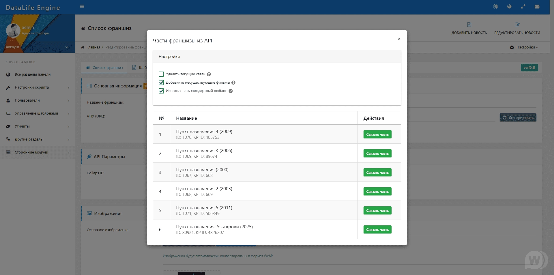 Это готовое решение для автоматического создания и сбора фильмов по франшизам. Он сам группирует все части одной франшизы по API Collaps, создает части фильмов и сериалов связывая материалы с базой данных, если на сайте нет части фильма он создает кастомную запись где выводит плеер, позже можно создать фильм и он свяжет его с частью.