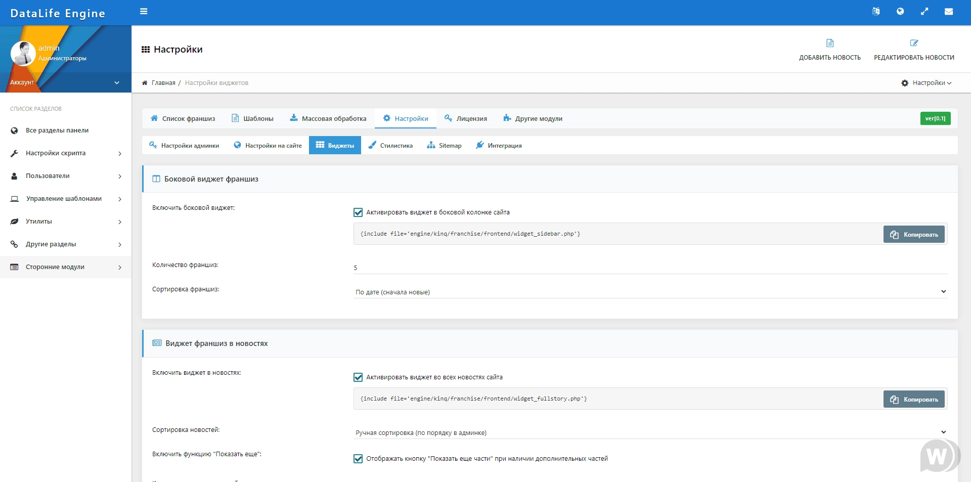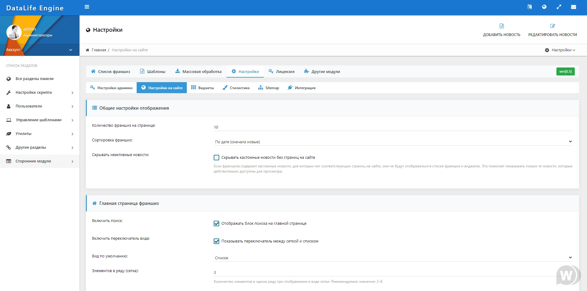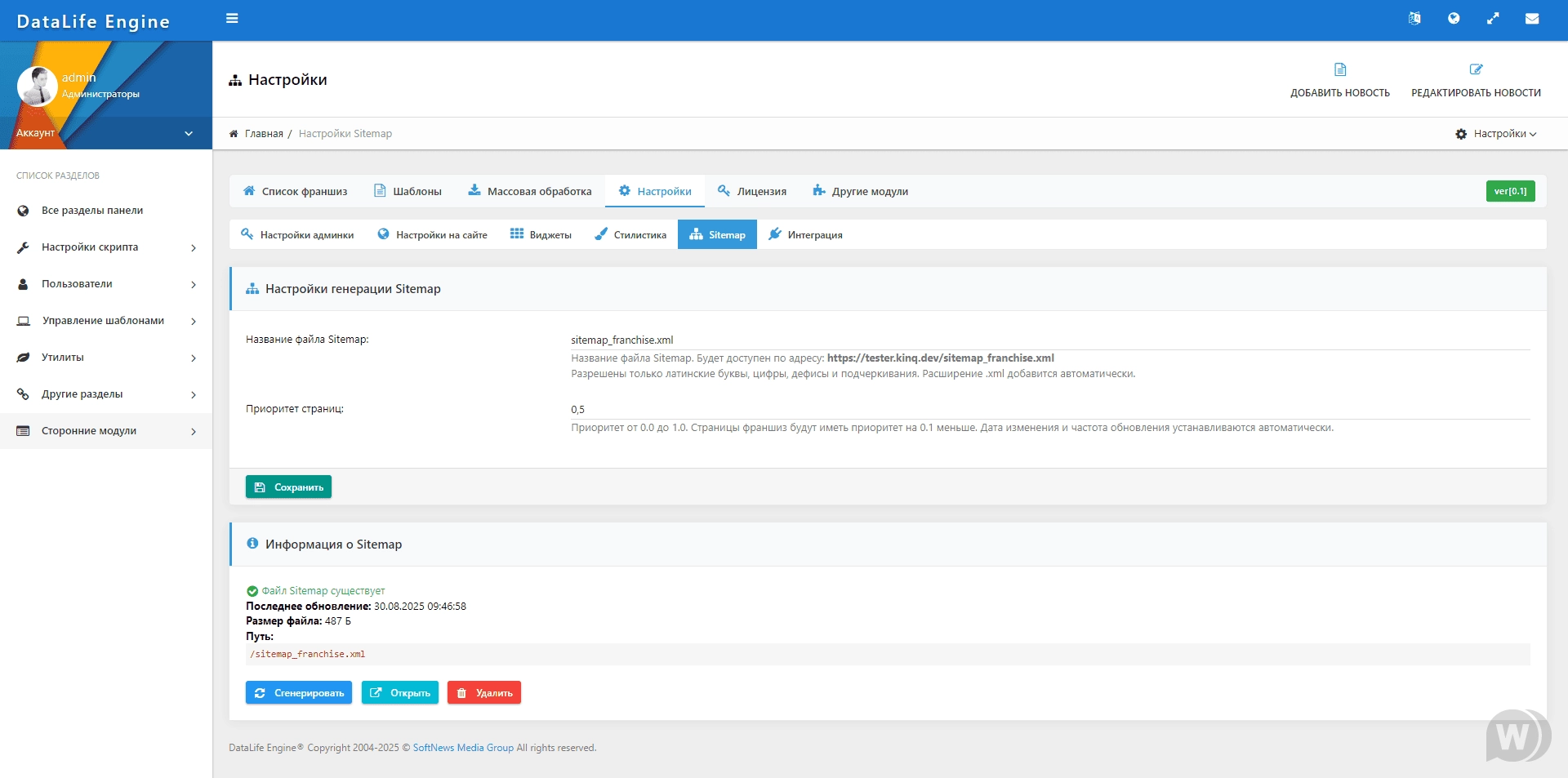 - Гибкие настройки админки, стилей, sitemap и отображения