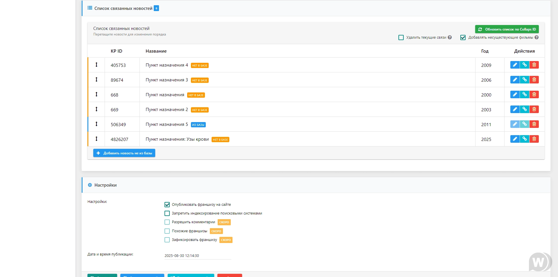 - Если фильмов на сайте немного то можно использовать всегда поиск фильмов для связи по kinopoisk id в доп полях новостей, но если их 20-100к то лучше включить индексацию, которая на Шаг 1 забирает из доп полей кинопоиск айди и айди фильма и будет в секунды связывать новости на шаге 3 или просто при добавлении франшизы.