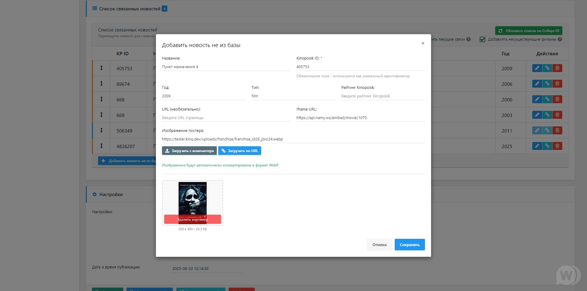 - Автозагрузка и оптимизация постеров (в том числе WebP)
